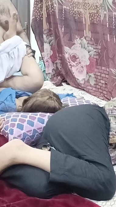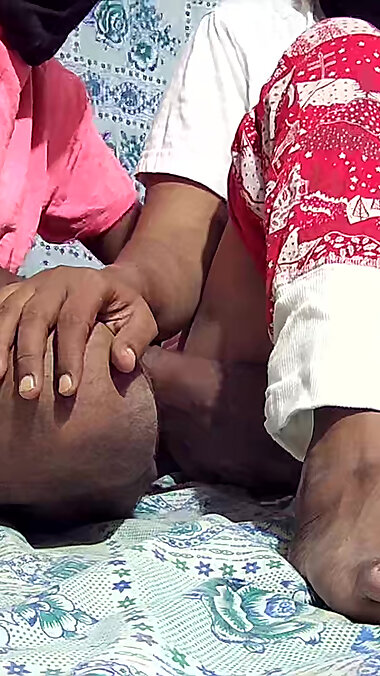 "Sisters enjoying threesome romance in bed with neighbour batchelor men"